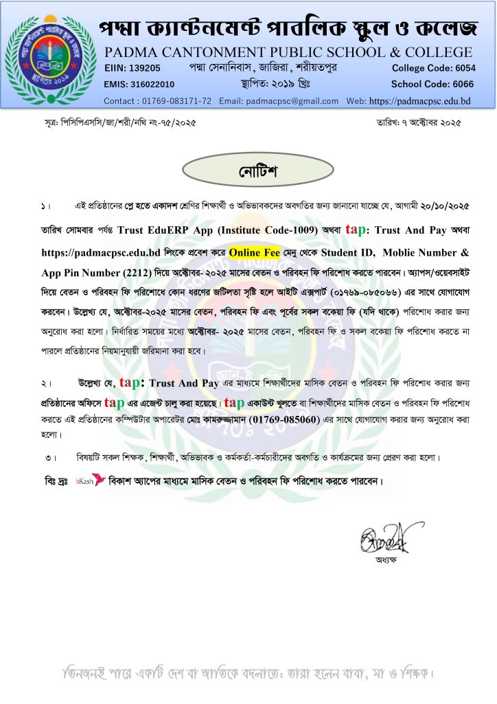 অক্টোবর ২০২৫ এর বেতন ও পরিবহন ফি নোটিশঃ