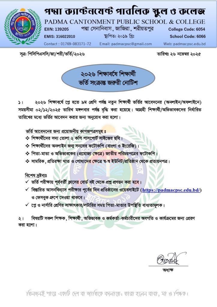 ২০২৬ শিক্ষাবর্ষে শিক্ষার্থী ভর্তি সংক্রান্ত জরুরি নোটিশ: